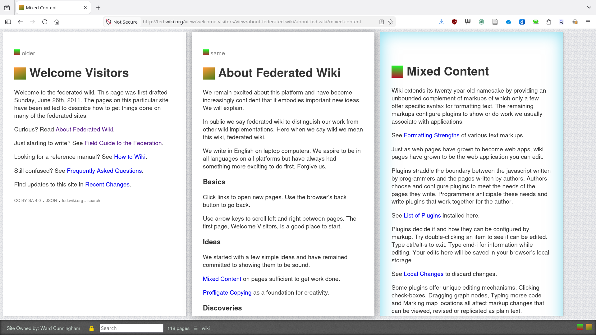 A traditional wiki contains a single concensus version of each page. In Federated Wiki, participants maintain their own personal versions of each page, but follow the work of their peers and borrow material from them to make it their own. Another important evolution from traditional wikis is that pages can contain not only text and images, but also data and tools, which are implemented as plugins to the Federated Wiki software.