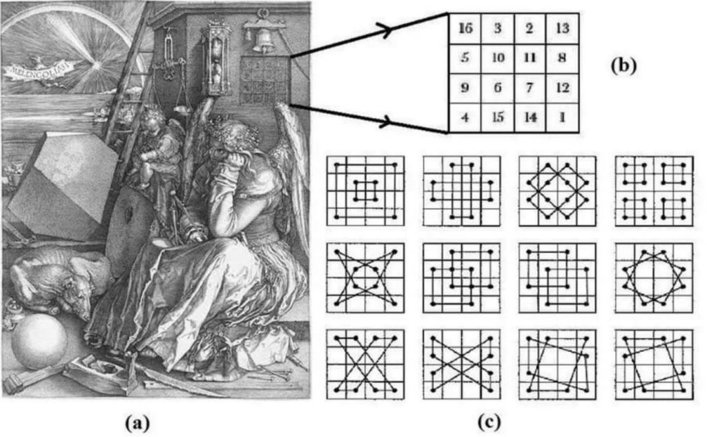 Albrecht Dürer’s magic square in his engraving Melencolia I (1514) is a symmetrical square with 86 sum combinations of the number 34.