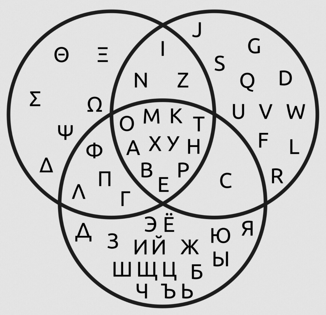 Venn diagram of Greek, Latin and Russian Cyrillic upper case graphemes.