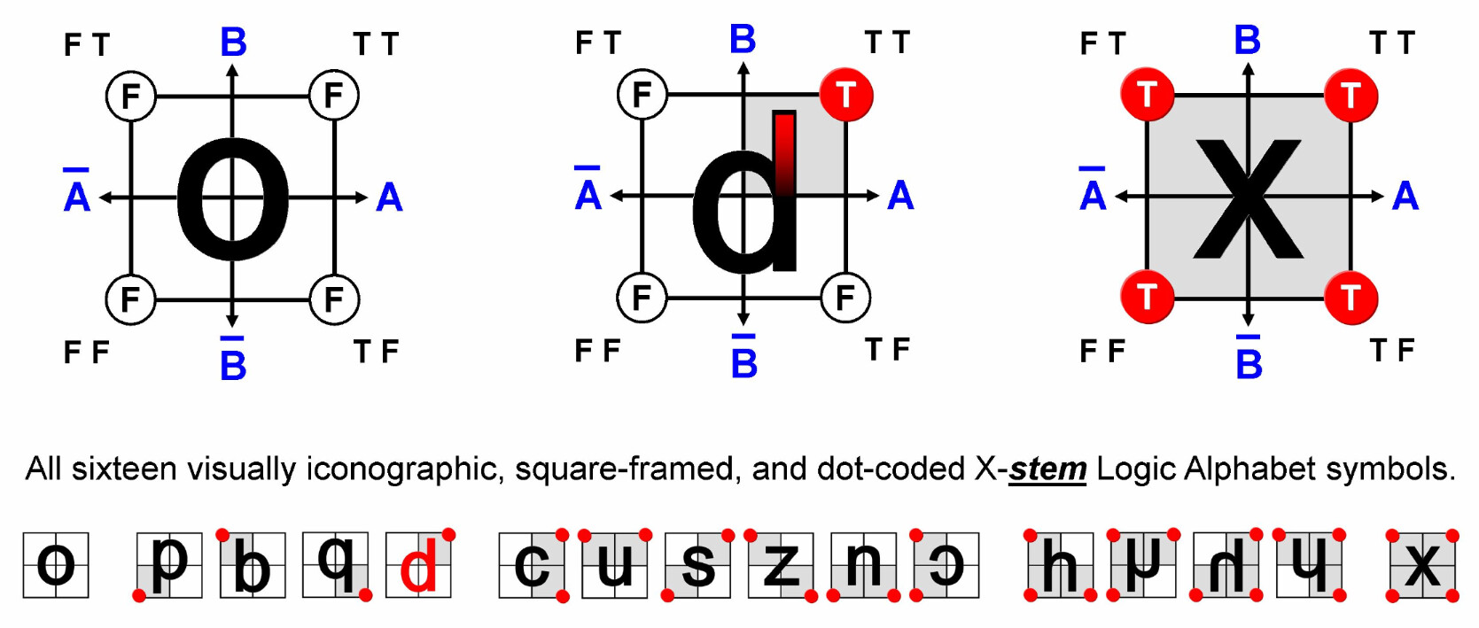 The idea is to represent the truth functions in the form of a square matrix, and then to assign a letter shape to each of these matrices. When drawing a logic symbol, one passes through each square with assigned F values while stopping in a square with assigned T values.